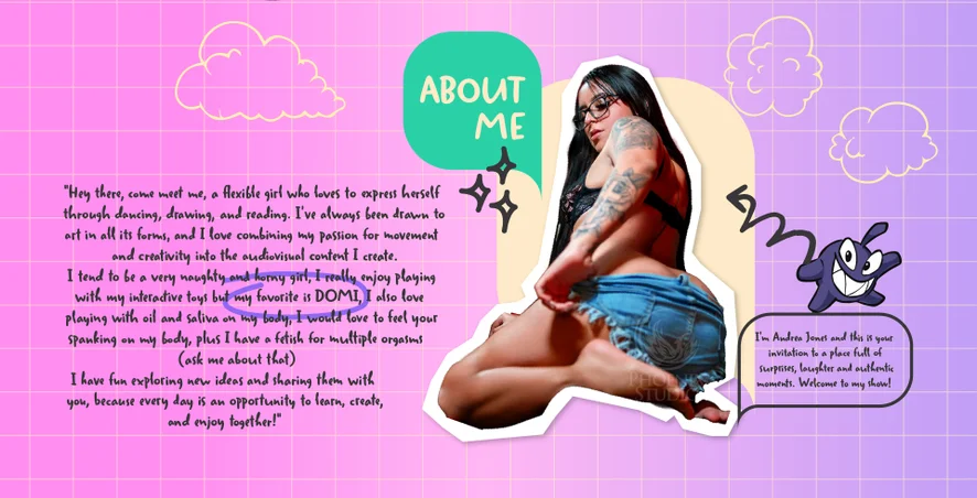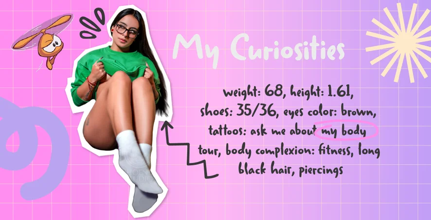 "Hey there, come meet me, a flexible girl who loves to express herself through dancing, drawing, and reading. I've always been drawn to art in all its forms, and I love combining my passion for movement and creativity into the audiovisual content I create.