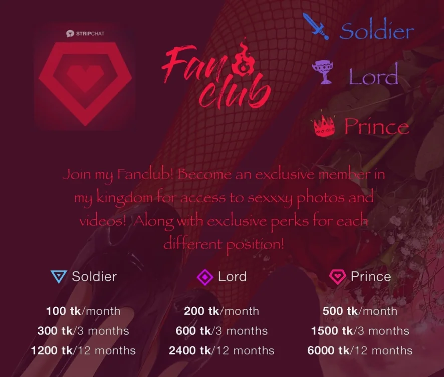 🎁BENEFITS MY FAN CLUB🎁 Solder 👠Special Badge in Chat 👠Exclusive Media Content 👠Tip menu discount 10% 👠Free Pm 👠Sexy content in the month Lord 👠Special Badge in Chat 👠Exclusive Media Content 👠Tip menu discount 10% 👠Private Show discount 10% 👠Free Pm 👠Sexy content in the month Prince 👠Special Badge in Chat 👠Exclusive Media Content 👠Free Spying 👠Tip menu discount 10% 👠Private Show discount 10% 👠Private Show Exclusive discount 10% 👠Free Pm 👠Sexy content in the month