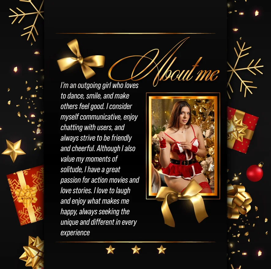I’m an outgoing girl who loves to dance, smile, and make others feel good. I consider myself communicative, enjoy chatting with users, and always strive to be friendly and cheerful. Although I also value my moments of solitude, I have a great passion for action movies and love stories. I love to laugh and enjoy what makes me happy, always seeking the unique and different in every experience