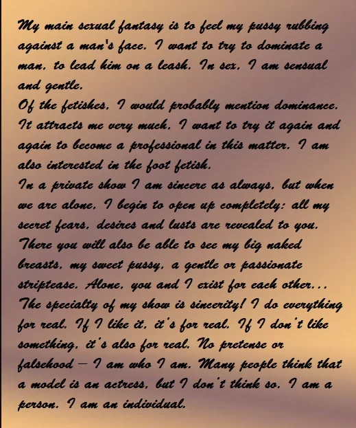 Ahegao, Camel Toe, Dirty Talk, Flashing, Office, Spanking, Oil Show, Erotic Dance, Foot Fetish, Facesitting, Fingering, Upskirt, Striptease, Twerk, Topless, Masturbation, Nylon, Humiliation, Orgasm, Cowgirl, Doggy Style, Outdoor, Dildo or Vibrator, Shower, Jerk-off Instruction, Leather, Corset, Cosplay, Cooking, Latex