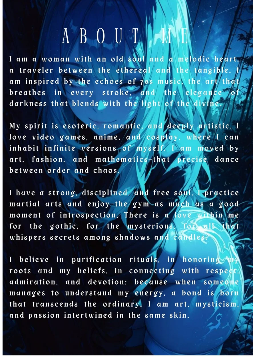 Bonjour, je suis votre modèle Latina colombienne gothique et ézotérique, ma peau est douce, blanche, lisse et délicate, mes cheveux sont courts et droits, mes lèvres sont embrassables et mon visage a un charme coquette et séduisant qui peut vous hypnotiser, mon regard est pénétrant et tendre à la fois, mon corps est grand et sexy, avec des seins irrésistibles parfaitement sexy. Mes jambes sont grandes et fermes, ce qui témoigne de mon dévouement à la salle de sport. Bien que je puisse être soumise et adorable, je suis aussi une dominante déterminée, j'aime beaucoup de choses... Creampie, Branlette, Sloppyblowjob, Gokkun, SPH et plus encore, avec moi, vous pouvez vous sentir libre d'exprimer vos fantasmes les plus profonds... parlons-en ♥ Je suis une femme aimante et dévouée, j'aime exprimer mon amour à travers les mots et mes mains, j'aime que tu sois très descriptif avec moi, laisse-moi ressentir chaque mot et partageons-le ensemble, tu ne connais toujours pas le meilleur de moi