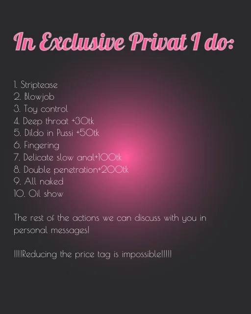 Topless, Striptease, Oil Show, Erotic Dance, Spanking, Foot Fetish, Twerk, Ahegao, Camel Toe, Anal, Anal Toys, Cooking, Creampie, Dirty Talk, Flashing, Latex, Massage, Shower, Smoking, Strapon, Yoga, Dildo in Pussy+50tk, feets, oil, Naked, Deepthroat, Heels, Fingering, Blowjob, Sex Toys, Dildo or Vibrator, Doggy Style, Fisting, Masturbation, Orgasm, Squirt