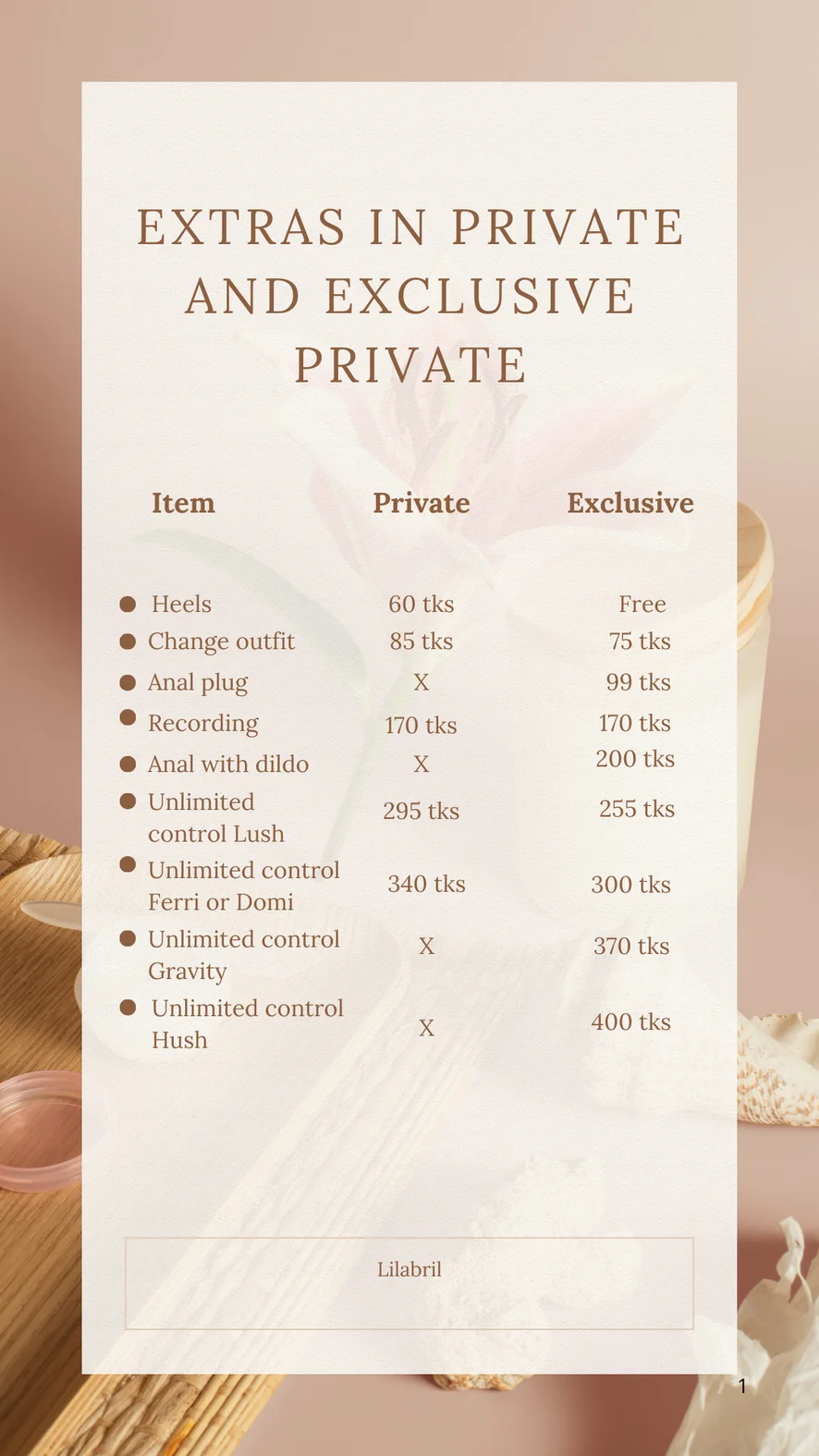 Ahegao, Camel Toe, Topless, Flashing, Doggy Style, Striptease, Erotic Dance, Spanking, Foot Fetish, Fingering, Blowjob, But Plug 99 tks extra, Seductive pole dance, Anal dildo 200 tks, Dirty Talk, Orgasm, Cowgirl, Corset, Heels, Sex Toys, Dildo or Vibrator, Nipple Toys, Oil Show, Masturbation, Anal Toys, Role Play