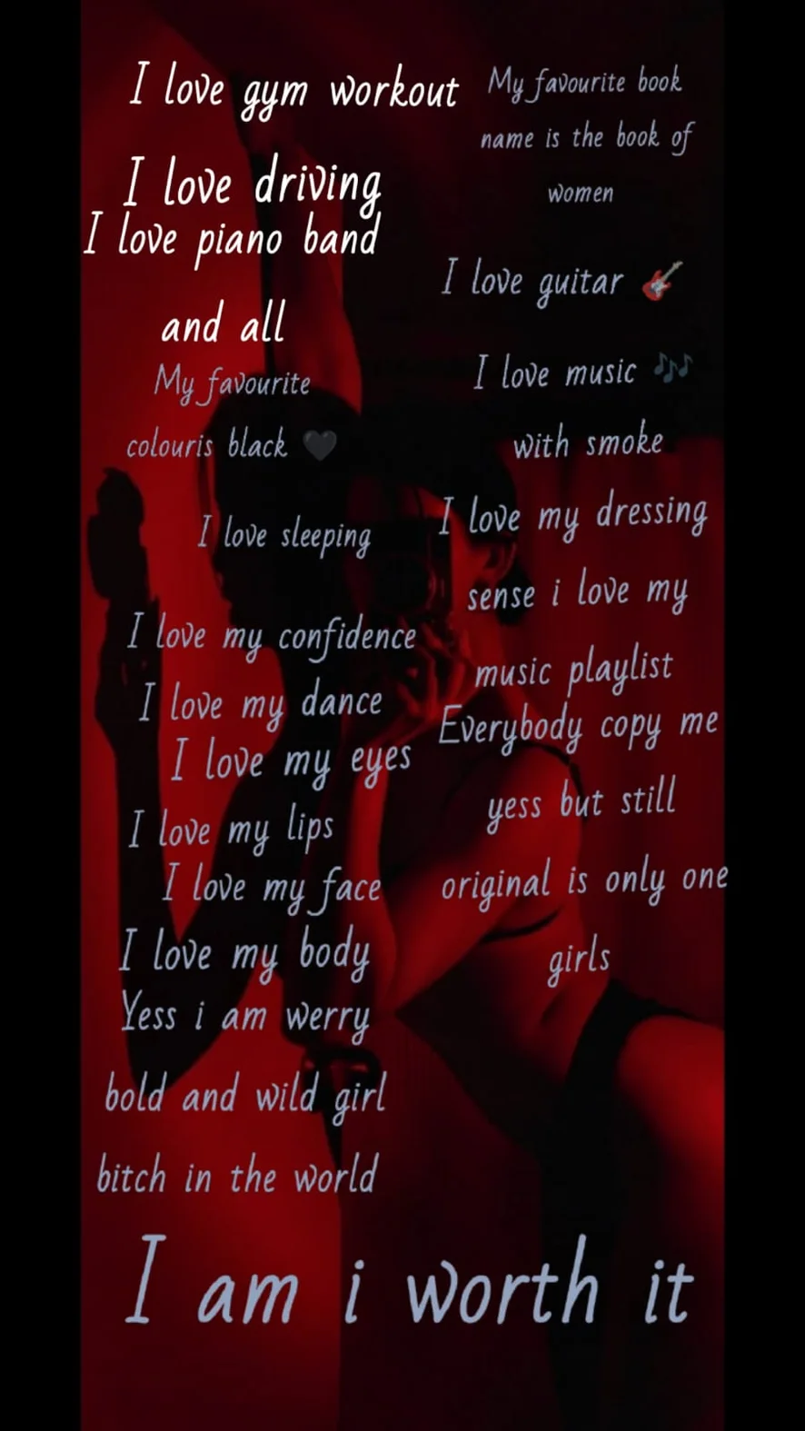 "Independent spirit, magnetic personality, and a life💋💋 I love. #SelfMade #Confident" Show that she is ambitious, has dreams, and works to achieve them, creating her own destinyThis can be portrayed through confidence, self-love, a captivating aura, or a playful sense of allure