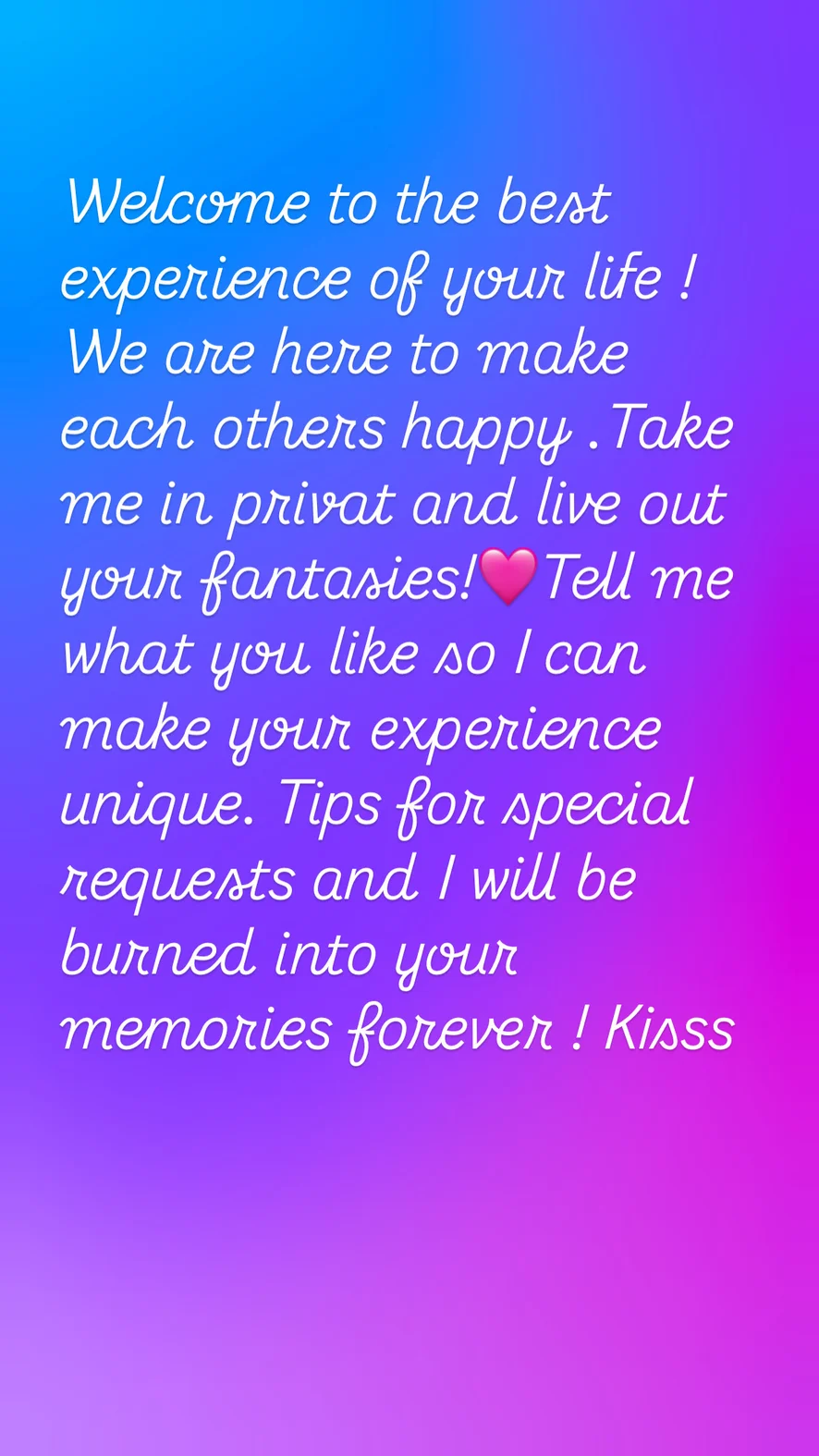 💋 Hi, stranger… or should I say future obsession? I’m the sweet escape you didn’t know you needed — soft voice, naughty smile, and eyes that will make you forget the world. I’m here to tease you, to tempt you, and maybe… to drive you a little crazy. I love to play, to flirt, and to slowly undress your mind before I undress anything else. 💫 Behind this innocent look hides a wild imagination and a heart that beats faster when I feel your eyes on me. I’m not just a pretty face — I’m a mood, a vibe, a secret waiting to be unwrapped… 💕 Come closer. Let’s create our little fantasy, just you and me. You found me. Now what are you going to do about it?