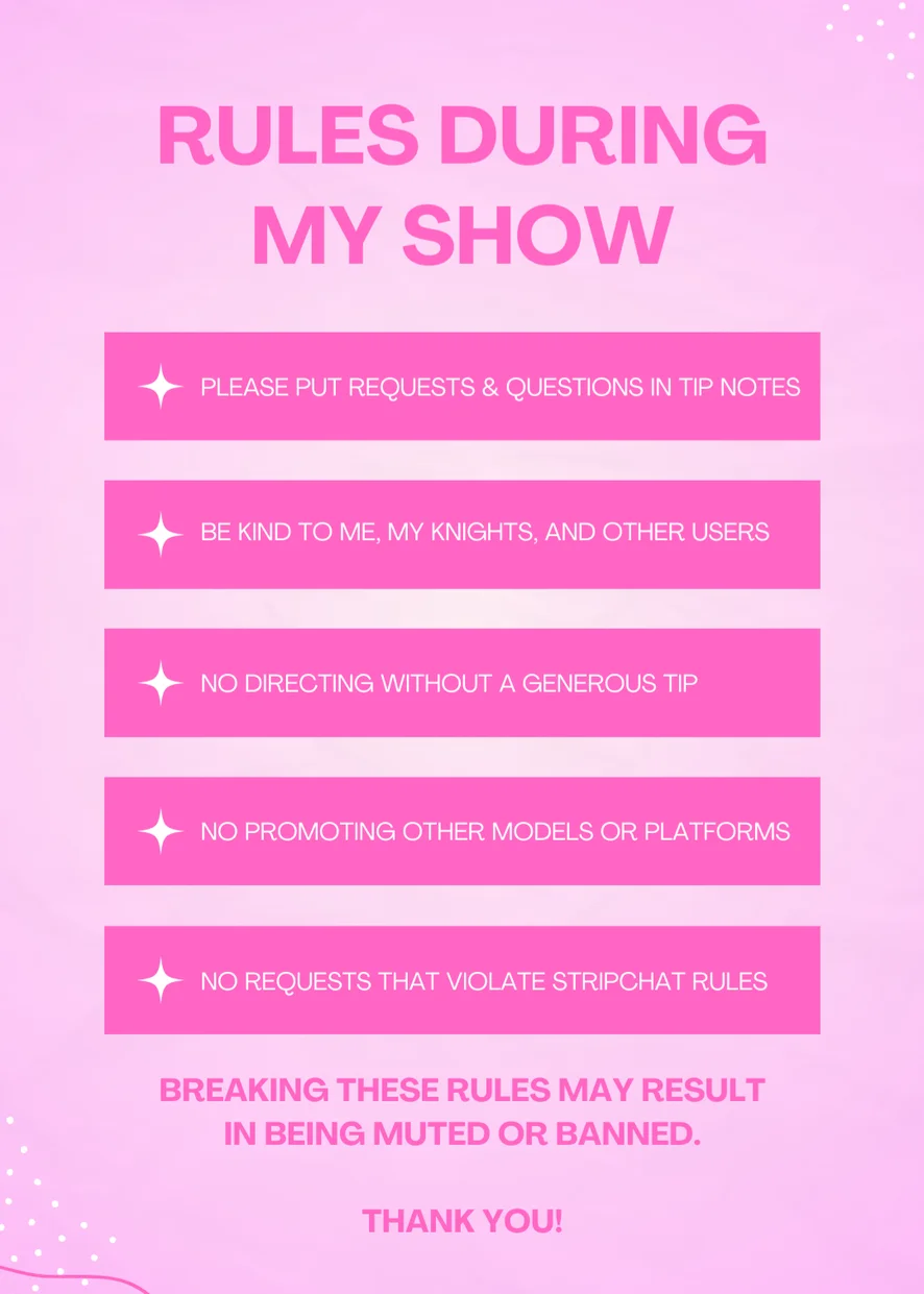 As long as your fetish, kink, or roleplay idea abides by the rules of the site, hit me up and teach me what you like so we can make your wildest (or weirdest) fantasy come true. Just make sure to PM me first so I can be prepared! I promise to be honest if I feel like I am not able to perform your roleplay or fetish with FIVE STAR private show quality. THANK YOU to my loyal regulars who make me look forward to logging in for my shows and are always down to get very wild and sometimes a little weird with me!