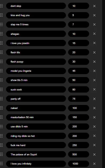 Sex Toys, Nipple Toys, Humiliation, Doggy Style, Corset, Leather, Latex, Heels, Twerk, Camel Toe, Spanking, Facesitting, Cuckold, Striptease, Facial, Gagging, Oil Show, Topless, Role Play, Fingering, Tittyfuck, Foot Fetish, Creampie, Blowjob, Flashing, Ahegao, Erotic Dance, Cock Rating, Dildo or Vibrator, Dirty Talk, Deepthroat, Jerk-off Instruction, Orgasm, Masturbation, Anal Toys, Hardcore, Footjob, Cowgirl