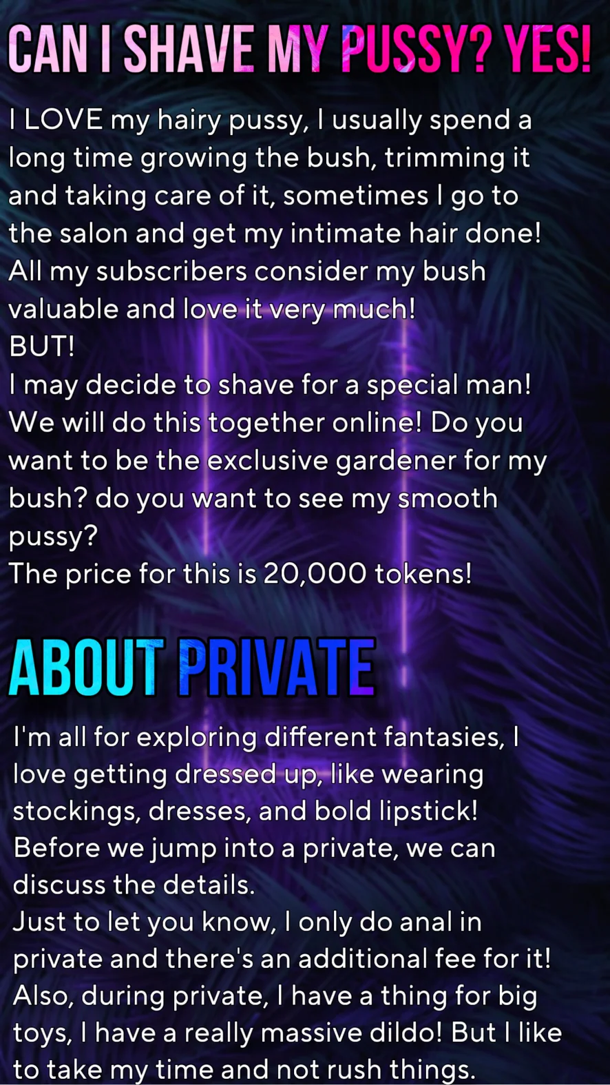 Dirty Talk, Nipple Toys, Fingering, Masturbation, Blowjob, Spanking, Oil Show, Heels, Nylon, Foot Fetish, Handjob, Dildo or Vibrator, Doggy Style, Deepthroat, Fisting, Humiliation, Anal Toys, Double Penetration, Anal, Orgasm, Role Play